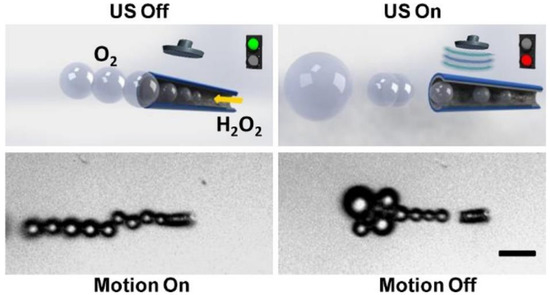 Set images (schemes, top, and true micrograph, bottom) showing the ultrasound-modulated motion of chemically powered motors. Reprinted from Xu et al. [94], with permission from the American Chemical Society. Copyright (2014).