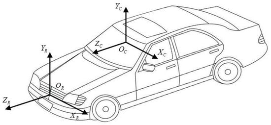 As shown in Figure 3, is the camera coordinate system, and is the millimeter-wave radar coordinate system. The millimeter-wave radar has a distance of from the camera in the axial direction, and a distance of from the camera in the axial direction. The transformation relationship between the millimeter-wave radar coordinate system and the camera coordinate system is shown in Formula (2).
