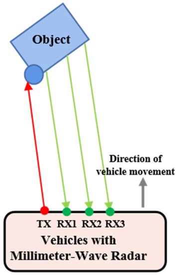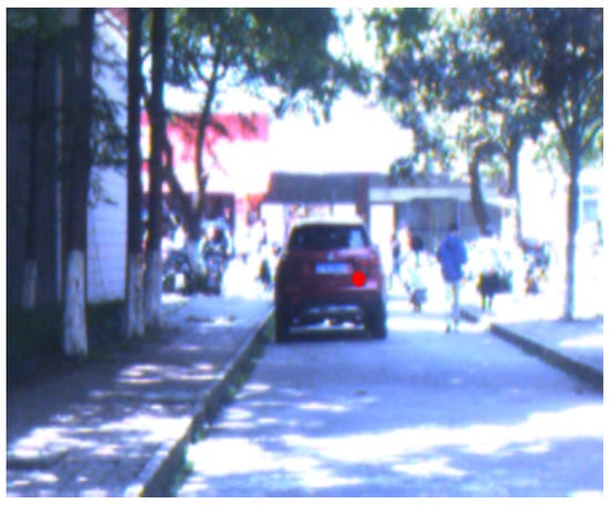 The acquisition of the region of interest includes the determination of the location and size of the region. As shown in Figure 4, the millimeter-wave radar consists of one transmitter (TX) and four receivers (RX), and the three-dimensional coordinates and speed of the front target are obtained according to the reflected waves of different phases. The three-dimensional coordinates (XR, YR, ZR) of the target are used as the center point of the region of interest. Specifically, Formula (2) is used to complete the conversion from the millimeter-wave radar coordinate system to the camera coordinate system and combined with Formula (1), the center point is projected onto the image (the red point in Figure 5), and the center position of the region of interest is completed.