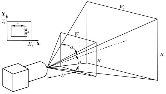 Considering that the vehicle outline is roughly rectangular, a rectangular region of interest is established with the projection point of the radar detection target as the center. After acquiring the mapping point of the millimeter-wave radar data in the image, the point is taken as the center of the rectangular frame. The size of the rectangular frame is determined according to the perspective transformation of the camera. Figure 6 is a schematic diagram of a perspective transformation where is the distance from the camera to the vehicle, is the vehicle height, is the vehicle width, is the height of the field of view, is the width of the field of view, is the vertical angle of view, is the horizontal angle of view, is the width of the captured image, is the height of the captured image, is the width of the vehicle in the image, and is the height of the vehicle in the image.