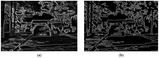 - After calculating and , according to the structural characteristics of the driving scene, the maximum pixel gradient size is set to 0.5, the minimum pixel gradient size is set to 0 as the threshold, and the pixels located at the edge are extracted. Figure 10a shows the edge detection result using the Sobel operator. It can be seen that a significant vehicle contour curve can be plotted.