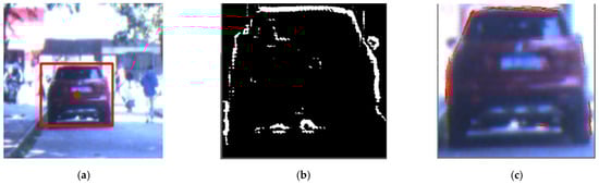 In this paper, the probabilistic Hough transform [] is used to detect the contour line of the vehicle shape by voting. The transformation process takes place in the parameter space. By calculating the local maximum value of the accumulated result, a set conforming to the specific shape is established as a result of the Hough transform. Figure 11b is determined after edge detection and the binarization of the radar identification area in the red frame in (a), then the Hough transform is performed to fit the vehicle contour line. By setting the accumulated plane threshold, the minimum straight-line length and the maximum interval of the line segment, as shown by the red line in (c), the vehicle contour with straight-line characteristics can finally be fitted, and the coordinates of each pixel in the fitted line can be determined.