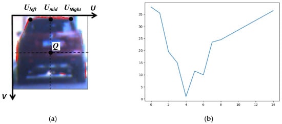 In symmetry analysis, the concept of symmetry is introduced []. Firstly, the straight line of the vehicle contour fitted above is analyzed, as shown in Figure 13a. Since there is a good boundary between the roof and the environment, this paper firstly uses the roof fitting line as the detection standard, then calculates the horizontal distance between the left endpoint of the roof line and the image origin. Following this, the horizontal distance between the right endpoint and the image origin, and the horizontal distance between the middle point of the roof line and the image origin, can be calculated according to Formula (7).