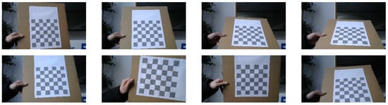 To verify the performance of the vehicle symmetry detection algorithm, the camera is first calibrated. As shown in Figure 14, this paper uses an 11 × 8 checkerboard diagram, in which the side length of the small square is 20 mm. The internal parameters are calibrated according to 20 multi-position and multi-angle chessboard diagrams taken by the fixed camera.