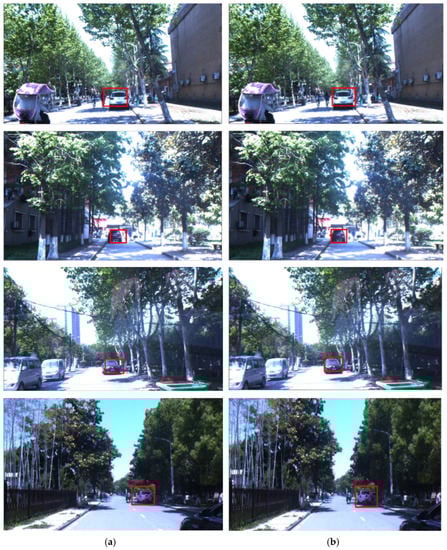 After the coordinate conversion between the camera and the radar, this paper collects the camera and radar data on a campus road based on the built experimental platform. The algorithm is written in Python, with radar frequency band 77 GHz and camera resolution 1280 × 720. Figure 15 shows the best symmetry recognition results at different distances. Figure 15a is the radar’s initial region of interest. It can be seen that this region does not completely contain the entire vehicle. Figure 15b shows the optimal detection region corrected by the algorithm. It can be seen that the vehicle has good symmetry characteristics in this region, and analysis of the experimental results shows that the single-frame processing speed of the algorithm is as fast as 28 ms, which means that the algorithm has a faster processing speed.