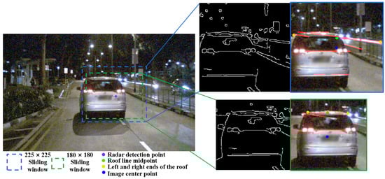 To verify the robustness of the proposed method, we select a night-time scene with poor lighting for qualitative analysis. As shown in Figure 16, an initially inaccurate sliding window can be generated in the image from the raw radar detection points. When we use the 225 × 255 window (blue box), commonly used during the day for correction, the right endpoint (yellow dot) of the roof is wrongly positioned on other targets on the road, and it cannot be accurately translated to the symmetrical area of the vehicle, resulting in detection failure. We further reduce the size of the sliding window and find that the window size of 180 × 180 (green box) does not greatly affect the performance of the Canny edge detection; more importantly, it can effectively overcome the interference of irrelevant factors. Therefore, selecting sliding windows of different sizes is a solution to adapt to scenes of different levels of complexity.