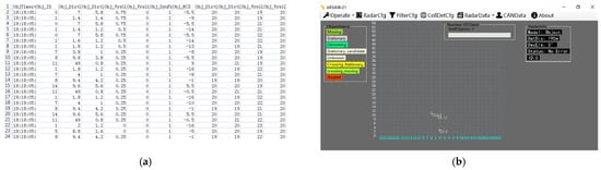 To verify the recognition accuracy of the algorithm in this paper, the initial video of the camera and the raw data of the millimeter-wave radar are collected. Figure 17a shows the front target-detection results of the millimeter-wave radar at different times, representing the distance between the target and the x and y directions of the radar, and the azimuth angle between the target and the radar. Figure 17b shows the visual interface of radar detection, which helps us better understand the relative position between the target and the radar at the current moment. The interface includes the target information, target properties, radar status, number of targets, and number of filters.