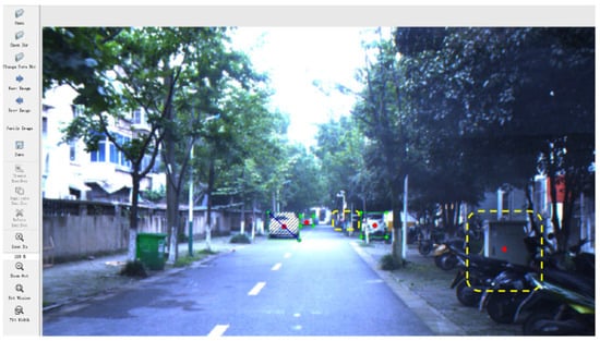 The 520 frames of the collected video and the radar data at the corresponding moment are selected, and we project them onto the image (as shown by the red dots in Figure 18). LabelImg software is used to label the vehicle in the image (green box in Figure 18), ensuring that the labeled boxes completely and symmetrically surround the entire vehicle area, where the center point of the area is taken as the real center point. It is worth noting that for a fair evaluation of the performance of the proposed method, we do not label the false and missed targets of the radar (the yellow area in Figure 18). This is because the false detection object lacks the image features of the vehicle, and the missed detection object lacks the position information provided by the millimeter-wave radar. After labeling, the accuracy of the initial radar recognition area and the recognition area generated by the algorithm in this paper are verified, respectively, as shown in Formula (9). The mean square error is used to measure the error between the recognition area and the real area in the horizontal direction of the image: