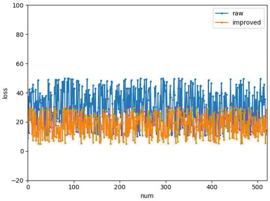 where is the direction coordinate value of the real center point, is the direction coordinate value of the center point of the recognition area, and is the number of detection samples. As shown in Figure 19, the blue point indicates the projection point error of the raw radar data, and the yellow point indicates the projection point error after improvement of the algorithm in this paper. It can be seen that using image information to correct the raw radar data can greatly reduce the shift of the original detection frame in the horizontal direction. Compared to the raw radar data , the in this paper is 19.5, with the error reduced by 13.4, which proves the effectiveness of the radar and the camera information’s fusion in this paper.
