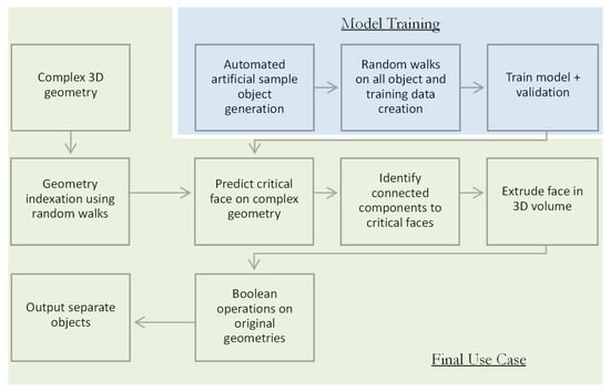 The last dimension is reduced to 8 in step 2 and to 16 in step 3. The tensors from the walk length, the number of walks, and the feature dimension are reshaped between each layer. Finally, an operator with multiple dense layers is applied for the prediction. The continuous reduction of the dimensionality of the hidden space leads to a network achieving a final detection rate of 88% on the validation set presented above, without overfitting, calculated on the validation data set (known critical features to be detected). In addition, a geometry composed of all trained features and an untrained feature (the helix hole) is successfully recognized and segmented (Figure 3).
