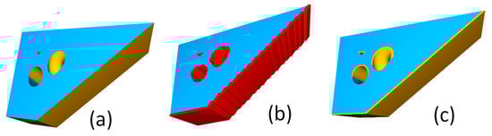 To generate the critical object from the critical surface, a ball cloud pivoting surface reconstruction algorithm, as presented by Bernardini et al. [19], is implemented. This allows the reconstruction of a triangle mesh from the mathematical description of the geometry by rotating a fictive “ball” around the first point selected until it reaches 3 points, then the triangle is formed and the ball is switched to the next point in the cloud of points. It is interesting to note that the marching cubes approach, as per the definition proposed by Lorensen and Cline [20], could represent a suitable and drastically faster solution, but smaller cubes result in gaps on the critical surface or require larger critical regions. As per Figure 3b, this method is not regular and not implementable for the clean resolution of each feature. A stair case effect is present on the overhanging surface, and the holes are poorly defined.
