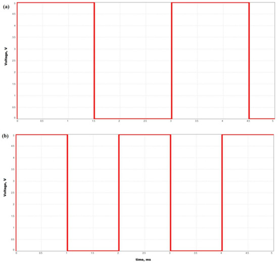 Equations (3) and (4) show that to increase the accuracy, it is necessary to amplify the measured signal before feeding it to the ADC input. To perform this, we used an operational amplifier (OP amp). The LM358ADR chip, which has two op-amps, was used as an op-amp in the designed electrical control circuit. Calculation of the output voltage was made with Equation (5) of the non-inverting scheme of the OP amp.