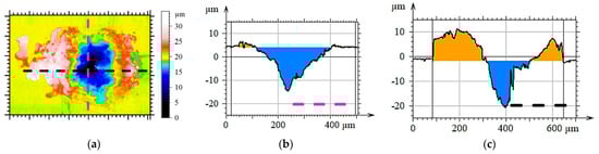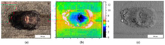 In this study, a confocal white light microscope was used to visualize the topography of a stressed contact system. As a result, topographic surface images (Figure 2a), as well as profile lines of different directions within the contact zone, were realized, Figure 2b,c. Quantitative estimations of wear depth and volume can be made. Thus, the topography investigations show the wear of the tin coating and the agglomeration of wear particles at the edge of the contact zone. Especially for noble metals, the wear of the coating is critical.