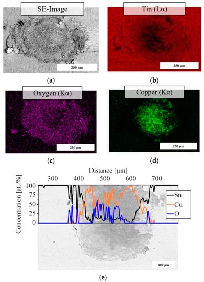 The EDS method enables the investigation of chemical elements for the evaluation of damage mechanisms. Thus, the element concentration in the wear zone of electrical connectors can be investigated qualitatively by using element mappings, Figure 4b–d, or quantitatively by a line scan, Figure 4e. The tin signal shows a reduction and an equally increased copper concentration is present. This could be due to the fact that the tin layer has been worn through by the fretting movements. Furthermore, an increased concentration of oxide has been detected. That is an indication that fretting corrosion has occurred. The advantage of element mapping is that a holistic evaluation of the contact zone is possible. However, line scanning enables locally high-precision measurements and conversions to quantitative element concentrations in atomic or mass percentage.