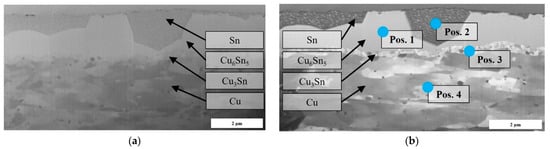 On the basis of the FIB cross-sections, an electrical connector stressed by temperature cycles is investigated by using electron beam stimulation (Figure 5a) and ion beam stimulation (Figure 5b). The layer components (Coating: Sn; Bulk: Cu; Intermetallic compounds: Cu3Sn and Cu6Sn5) become much more visible by ion beam stimulation in comparison to electron beam stimulation. The classification of the layer components was done by EDS measurements, Table 2. The element concentrations of the intermetallic compounds are comparable to the results of Braunovic [17] (p. 338). However, slight deviations of element concentrations compared to the phase diagram of tin and copper can be identified [57]. The electron and ion beams stimulate a volume of material despite the focusing during the analysis. This excited volume can rise a few micrometers into the material depending on the acceleration voltage. This could lead to slight deviations in the exact element composition. To reduce this effect, TEM analyses can be performed. However, the phases show different grain structures, which also makes a qualitative distinction for material experts possible by using this imaging tool.