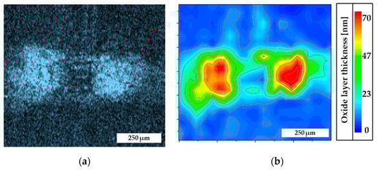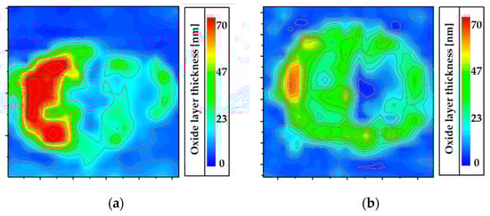 A quantitative evaluation of the oxide debris within the wear zone of damaged electrical contacts can be carried out by using Wavelength Dispersive X-ray analysis. By means of calculations, the oxide layer thickness of the stressed electrical contacts can be quantified. This is exemplified by two different contact areas in Figure 6. The contact zones are characterized by an oxide layer thickness up to 70 nm. In the unloaded area, oxide layers of a few nanometers are identifiable. These findings are in good agreement with the study of Tamai [44]. Other contamination layers, like carbon or sulfides, can also be calculated.
