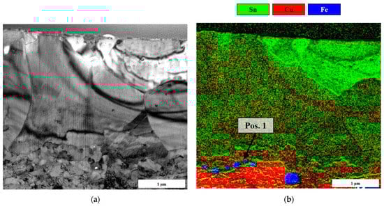 By means of coupled EELS measurement, chemical elements can also be assigned to the structure, Figure 7b. Thus, the tin layer, the intermetallic compounds and the copper substrate can be identified by qualitative element mappings. However, iron dispersions are located at the phase boundaries of the base material to the intermetallic compounds (Position 1). These iron dispersions are related to the alloy type and can be responsible for increasing stiffness.