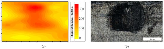 The result of an electrical resistance mapping in an electrical contact stressed by fretting corrosion is shown in Figure 8. The electrical contact resistance is increased (Figure 8a) within the degraded contact zone (Figure 8b). Outside the contact zone, a low resistance can be observed. Thus, the observed resistance distribution is an indicator of fretting corrosion. The implementation of this method is useful when the contact resistance in a connector is unstable which could be due to the localized oxide zones within the contact area. The extent of degradation due to small pockets of oxides in the contact area are, at times, not visible and also not clear from the measured contact resistance. In such cases, contact resistance mapping can be applied to identify the extent of degradation.