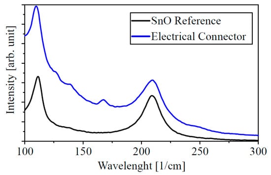 Raman Spectroscopy was also used in this study to determine the oxides formed on the surface of an electrical connector. First, a tin monoxide was measured as a reference powder and compared with a measurement of a stressed contact system, Figure 9. The results show that there are commonalities between the stressed contact system and the reference powder. Therefore, tin monoxide is present in the wear zone of electrical connectors stressed by vibrations and temperature cycling tests. However, other Raman signals can also be detected. Further contamination products could also be present on the surface. That is not discussed in this study.