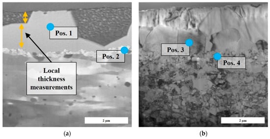 In addition to the energy dispersive evaluation of the X-ray by EDS, the information of chemical elements can also be evaluated using the wavelength of X-ray (WDS) [51]. Thus, a quantitative and qualitative elemental analysis is also possible using WDS [13] (p. 60). The energy resolution of WDS measurements is considerably higher than that for EDS measurements due to filtering of the wavelengths at the crystal of the system [52]. By using calculation methods, the conversion of mass ratio to geometric layer thicknesses can be carried out by assuming densities of oxide coatings [52,53]. The WDS mappings were realized by an electron-beam-microprobe-device Cameca SX100.
