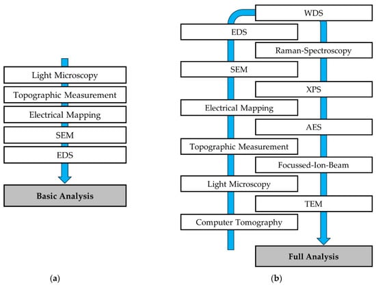 Recommendations for analyses workflows for the investigation and evaluation of failure modes of electrical connectors: (a) Basic analysis; (b) Comprehensive analysis.