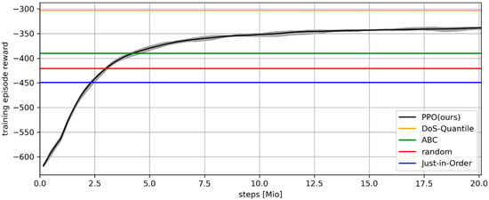 The Number of Assignments per Zone and Mean DoS per Zone columns give insights into the strategy learned by the DRL agent. Since DoS-Quantile is the best solution found on the data and Just-in-Order the worst, it is helpful to compare the results of PPO to those two. PPO assigns fewer pallets to zone A than DoS-Quantile, but more than Just-in-Order. One explanation is that PPO is pushed towards the Just-in-Order strategy at the beginning of training, because assigning most pallets to zone A gives the largest immediate reward. Over the course of training, the agent learns to move away from that short-sighted strategy for the sake of optimizing the cumulative reward across the whole learning episode. Yet, the number of assignments to zone A falls below the optimal number, indicating a potential remaining bias towards zone A.