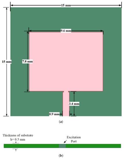 (a) Reference patch antenna model on a substrate (h = 0.5 mm, r = 2.2, tan = 0.0009) (a) top view, (b) side view.