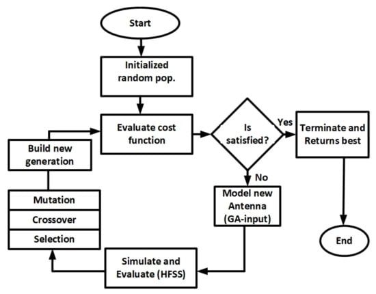 Antenna optimization and design are influenced by several elements, including operating frequencies, size, radiation pattern, gain, directivity, and others. The employment of autonomous algorithms in antenna optimization has grown significantly to solve the intricate and continuously developing problem of antenna technologies. Optimization using genetic algorithm is based on natural selection whereas it selects the fittest individuals to create offspring for the next generation. It is a search technique that handles a large number of optimum and approximated solutions from the solution space. In a binary-coded genetic algorithm, a gene is a binary bit with a value of “1” or “0”, the chromosome is a string of bits that represents an individual, and an individual is a single candidate solution drawn from the solution space []. In the search space, a population is a collection of individuals at any particular time. When the population size clustered as a single generation becomes large, the algorithm has more search space. However, it requires much more computational cost, memory, and time. The first generation is produced by a random process, while subsequent generations are produced by more fit and chosen individuals who have a higher likelihood of producing better offspring as reflected by the cost. Crossover and mutation operations are used to increase the population diversity []. The operator in charge of performing reproduction from two selected individuals is the crossover operator. In contrast, a mutation is used to increase the population diversity. This iterative technique produces successive generations until a stopping condition is met []. Figure 2 depicts a flowchart of the genetic algorithm implementation procedure applied in the antenna optimization.