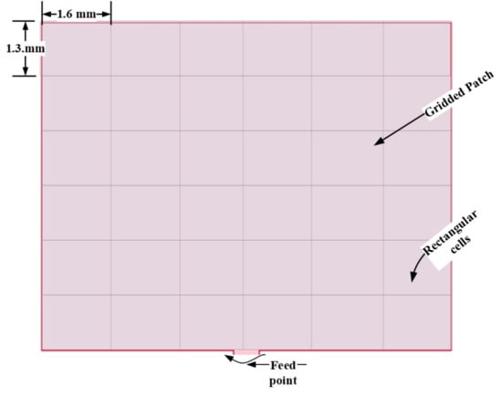 The patch surface can be partitioned into several geometric forms, such as circular shapes, as seen in []. However, rectangular cells are ideal for addressing the entire patch surface with on and off characteristics. The number of genes on a chromosome has a significant impact on computing time, the number of potential candidate solutions in the search space, and the performance of best-fit individuals. For instance, the authors in [] offered 8 × 8 gridded rectangular cells for a dual-band antenna optimization, while the authors in [] also presented 10 × 10 cells for a triband antenna optimization. However, the main concern of this algorithm in our optimization was searching for the best-fitted individuals from the given solution space. As a consequence, the reference antenna’s patch surface was divided into 6 × 6 small, random, and uniform rectangular cells to improve the patch shape, as shown in Figure 3.