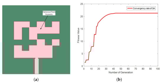The simulation converged after 40 iterations, as shown in Figure 4a, and the iteration continued for the next 60 generations to demonstrate the consistency of the convergence. Finally, Figure 4b depicts the best-fitted individual antenna based on the algorithm. The solution space had a capacity of 236 = 6.8 × 1010 individuals in it. If the computing time of each individual design was 1 s, the overall computation time to find the best-fitting individual would be 2.1 × 103 years. However, owing to the application of the genetic algorithm, the best-fitted individuals were picked in only 40.3 h while utilizing a computer with a core I7, 8 GB RAM, and 2.7 GHz of processing speed.