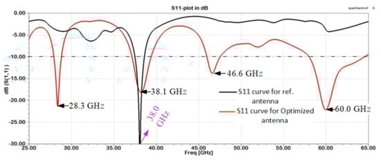 Simulated results of S11 for genetically optimized antenna and reference model.