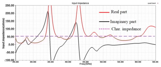 To have the maximum radiated power at the patch, the conjugate of the antenna input impedance and the transmission line characteristics impedance should be matched. Figure 6 displays the real and imaginary input impedance plot of the optimized antenna. By adjusting the transnational arm’s length in the microstrip feed line and optimizing the patch design during each iteration, a maximum power transmission was attained in this paper. It demonstrated that there were only minor differences between the antenna’s input impedance and the characteristic impedance of the transmission line. The input impedance of the engineered antenna was 44.31 + j5.64 at 28.3 GHz, 44.10 − j10.28 at 38.1 GHz, 65.65 − j18.39 at 46.6 GHz, and 51.92 + j7.95 at 60.0 GHz, as shown in Figure 6. Despite having a low reactance value, their real impedance value was close to the characteristic impedance. The findings indicated that the antenna and transmission line were nearly matched.