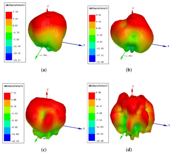The 3D gain plot of the proposed antenna in dB (a) at 28.3 GHz, (b) at 38.1 GHz, (c) at 46.6 GHz, and (d) at 60.0 GHz.