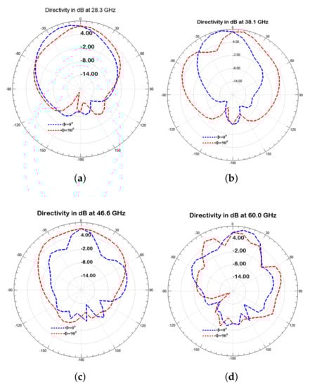 Figure 8 depicts the antenna’s directivity pattern in the planes of and , which was almost projected in a broadside orientation. Furthermore, a directivity enhancement in all working bands was observed. At 38.1 GHz, the maximum peak directivity of the optimized antenna was 8.8 dB at , while at 28.3 GHz, 46.6 GHz, and 60.0 GHz, peak broadside directivity values of 7.8 dB, 7.3 dB, and 7.1 dB were observed, respectively.