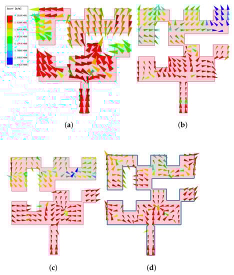Surface current distribution of genetically optimized antenna (a) at 28.3 GHz, (b) at 38.1 GHz, (c) at 46.6 GHz, and (d) at 60.0 GHz.