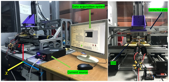 To determine the accuracy of FEM calculations, this paper uses the SCML-05 test system for verification. It was developed by our group and is used for 3D axial forces tests. The SCML-05 is shown in Figure 6. It is mainly composed of four stepper motors and a data acquisition system. In the test within this paper, the test system is used to measure the vertical levitation force and the horizontal thrust force of the EDW. The data acquisition system uses the software designed by LabVIEW. It can display, collect, and export force data and distance data in three directions.