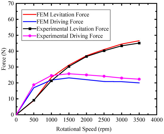 Comparison of experimental data and simulation results of levitation and driving forces of the EDW with different rotational speeds when the air gap is 10 mm.