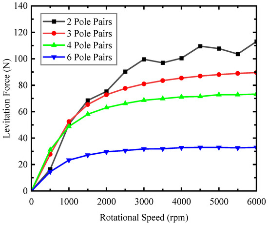 The results of the relationship between the levitation force and the pole pairs of the EDW are presented in Figure 8. The levitation force decreases as the number of pole pairs increases. The EDWs with two pole pairs can provide the largest levitation force, but it is not stable, because its frequency of magnetic field changes is too slow. It is better to choose the three pole pairs EDWs.