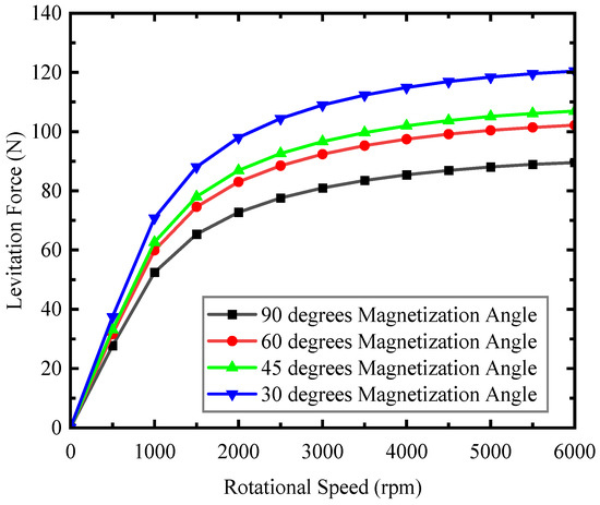 The results of the relationship between the levitation force and the magnetization angle of the EDW are presented in Figure 9. The levitation force increases as the magnetization angle decreases. This is because the magnetic field becomes closer and closer to the ideal Halbach array with the decrease of the magnetization angle. However, magnets with a magnetization angle of less than 30 degrees are difficult to process, so a magnetization angle of 30 degrees was selected in the end. Due to the experimental conditions, there is no way to perform verification experiments for the magnetic wheel with a 30-degree magnetization angle and three pole pairs. The previous experiments have verified the correctness of the finite element results, so this paper will use EDW with three pole pairs and 30 degrees. The specific parameters of the permanent magnet EDW finally used are shown in Table 2. The FEM results are presented in Figure 10 and Figure 11.