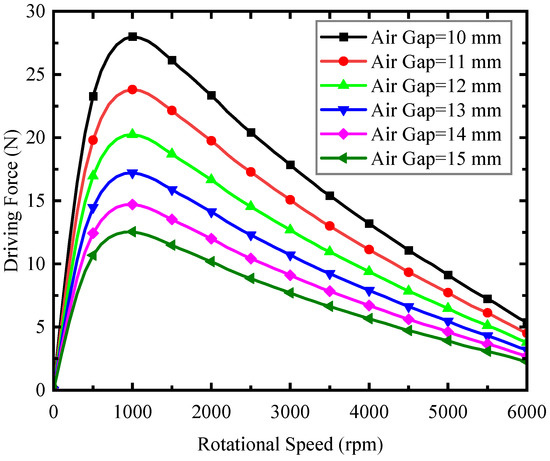 Relationship of the driving force with rotational speed of the EDW at different air gaps.