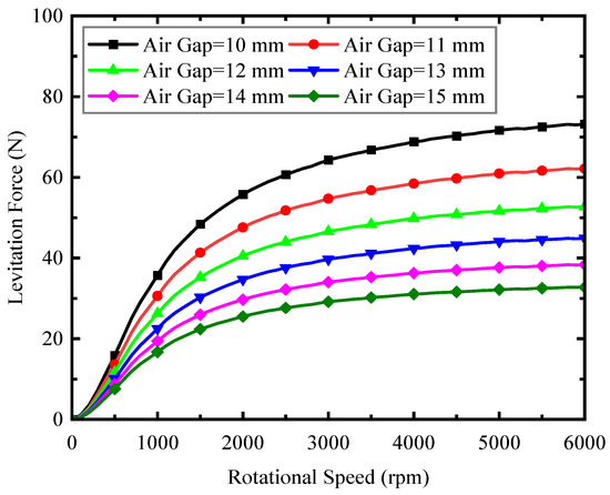 Relationship of the levitation force with rotational speed of the EDW at different air gaps.