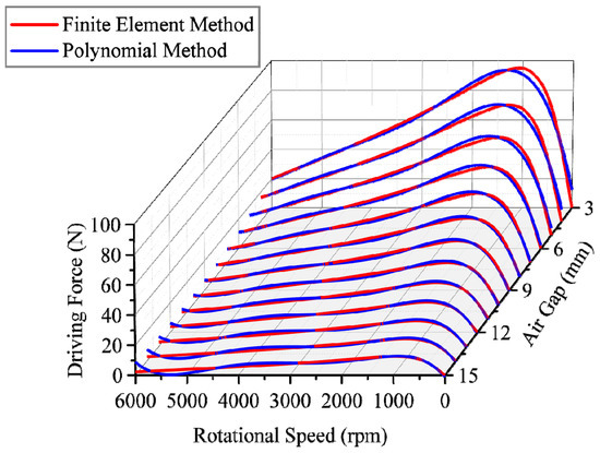 Comparison of polynomial method results and FEM results of driving force with different rotational speeds and different air gaps.