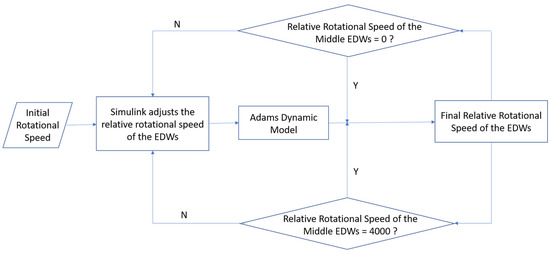 To control the maglev car, this paper proposes a feedback control strategy by adjusting the rotational speed to control the maglev vehicle. It is necessary to use the output of the system and make adjustments in time to form a feedback control. This article selects the relative rotational speed of the EDWs. By converting the translational speed of the maglev vehicle into the rotational speed compensation of the EDW, the relative rotational speed of the front and rear EDWs will always be maintained at 4000 rpm and the relative rotational speed of the middle EDWs will maintain at 0 rpm. When the maglev vehicle needs to accelerate, decelerate, and turn, the speed of middle EDWs will temporarily not be equal to 0 rpm. However, after adjusting the rotational speed of the EDWs through Simulink, the maglev vehicle will enter a stable state again. This control strategy is simpler and easier to implement. The control flow graph is shown in Figure 15.
