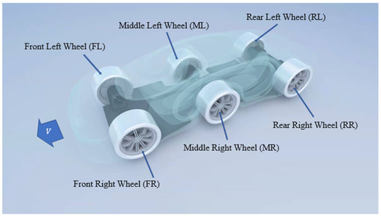 Magnetic levitation is a mode of transportation whereby a vehicle is suspended above or below a track using the interaction of magnetic fields to achieve attraction or repulsion for both lift and thrust [1]. High-speed maglev ground transportation vehicles typically use high-temperature superconducting (HTS) flux pinning levitation, electromagnetic suspension (EMS), or electrodynamic suspension (EDS) [1,2,3,4]. The HTS system mainly consists of the high-temperature superconducting (HTS) levitation units (containing HTS bulks) attached to the vehicle and the permanent magnet guideway (PMG) on the ground [2,5]. It has many merits, such as the lack of wheel–rail adhesion contact, passive self-stability, potentially faster running speed, low energy consumption, and so on [2,6,7,8]. The EMS system makes use of a set of electromagnetic coils along the length of the vehicle which is attracted to a flat steel track and is actively controlled in order to maintain an air gap between the track and carriage. Furthermore, compared to EMS which uses attraction forces, the EDS system utilizes repulsive forces for levitation [3,9,10,11]. Either superconducting or neodymium iron boron (NdFeB) magnets on a carriage induce currents in the conductive coils or conductive plates along the track as the vehicle travels [12]. Because of its low cost, EDS is being studied as a substitute for existing high-speed maglev systems [13,14,15]. At present, there are two main types of EDS technology: one is Superconducting Electrodynamic Suspension (SCEDS) and the other is Permanent Magnet Electrodynamic Suspension (PMEDS) [5,9]. Japan focused on low-temperature SCEDS technology in the 1970s [16]. It is used in the MLX maglev train. Through the use of the interactions between the superconducting magnets of the train and the “8”-shaped coils of the track, the suspension of the train is realized. As there is no wear or friction, the running speed of Maglev trains can reach more than 600 km/h [17]. PMEDS technology research has been developed in the 1980s with the advancement of NdFeB material production technology [9]. However, both PMEDS and SCEDS will create an unavoidable magnetic resistance. There are two ways to solve this problem. One is to mitigate this magnetic resistance, and the other is to convert the detrimental magnetic resistance into a useful propulsive force. Based on the second method, J. Bird et al. proposed a rotating annular Halbach structure electrodynamic wheel (EDW) at the end of the last century [18,19,20]. It is composed of EDW and a non-magnetic passive track that induces eddy current flowing. The Halbach magnet array can enhance the unilateral magnetic field and produce ideal magnetic field characteristics of the sinusoidal magnetic field waveform [21,22,23,24,25]. It can generate levitation force and magnetic resistance inside while EDW moves above a non-magnetic passive track [12]. By using EDWs as wheels to build a multi-EDW vehicle [3], it can convert the detrimental magnetic resistance into a useful driving force. Our group has studied the multi-EDW vehicle for several years. We have theoretically verified the feasibility of the multi-EDW vehicle and built a 1:50 PMEDS experimental prototype which has four EDWs [3]. However, the traditional four-wheel vehicle structure has a shortcoming: it can’t realize the steering function. Because the traditional four-wheel structure changes the magnetic resistance by changing the rotational speed to form a torque, this method will cause the suspension force of the four EDWs to be inconsistent, resulting in the change of the suspension air gap, which will affect the smoothness of the vehicle operation and lead to steering failure. To solve the steering problem of maglev vehicles, in this paper, we design a new concept maglev vehicle structure based on the radial Halbach permanent magnet array. Figure 1 shows its concept diagram. Although the use of six wheels will increase the overall cost of the vehicle, considering that this structure can help the car achieve steering, these increased costs are worthwhile, and the increase of guided wheels will not have any impact on the driving safety of the car. At the same time, the non-magnetic passive track structure can be more easily integrated into the existing traffic infrastructure. The construction cost will not increase too much. In addition, a novel control strategy is proposed in this paper to realize straight-line motion and pivot steering.