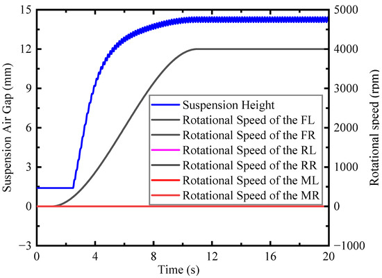 To achieve static suspension, the rotational speed of the front and rear EDWs are the same and the direction is reversed, when the maglev vehicle is at static suspension. By increasing the motor speed gradually from 0 to 4000 rpm, the PMEDS vehicle achieves suspension from stationary on the ground. During this period, the speed of the middle EDWs relative to the induction plate remains at 0 rpm. Figure 16 shows the diagram of the PMEDS car model. The rotational speed of the EDWs and suspension height of the maglev car and the levitation force of all the EDWs during the static suspension process are shown in Figure 17 and Figure 18, respectively.