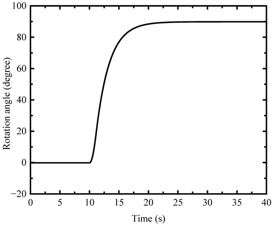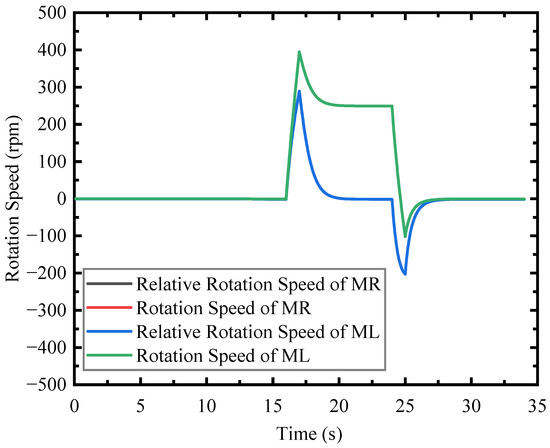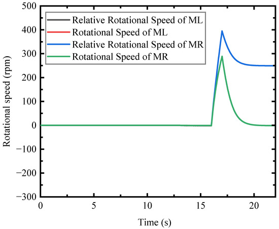 To achieve the process of pivot steering, it is necessary to keep the relative rotational speed of the front and rear EDWs at 4000 rpm. The rotational speed of the middle EDWs is equal in magnitude and opposite in direction, which will make the maglev car have a rotational speed w. The relative rotational speed and rotational speed of the middle right EDWs are shown in Figure 25 and the rotation angle of the maglev car is shown in Figure 26. This steering method can realize the car’s pivot steering by reducing the car’s turning radius. In large cities with lots of vehicles and narrow road sections, it can greatly reduce the driver’s driving difficulty.