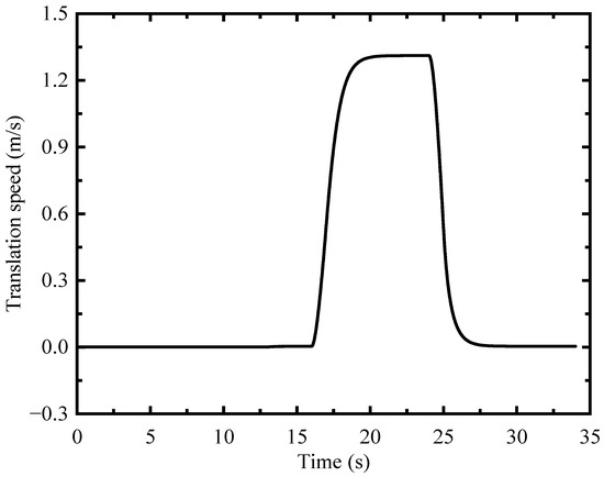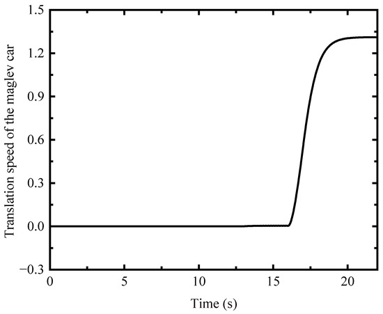 The relative rotational speed and rotational speed regulation process of the middle EDWs during acceleration and uniform speed is shown in Figure 19. The relative rotational speed and rotational speed of the front and rear EDWs and the translational speed of the maglev vehicle are shown in Figure 20 and Figure 21, respectively. From 1 s to 11 s, the rotational speed of the front and rear EDWs increases from 0 to 4000 rpm, and the maglev vehicle goes from a static state to a suspended state. From 16 s to 17 s, the rotational speed of the middle EDWs increases by 500 rpm, and the maglev vehicle begins to accelerate. But the rotational speed of the middle EDWs cannot reach 500 rpm due to the existence of the vehicle’s translational speed and feedback regulation during this period. The rotational speed of the front wheels increases and the rotational speed of the rear wheels decreases to keep the relative rotational speed of the front and rear EDWs relative to the conduction plate remain 4000 rpm.