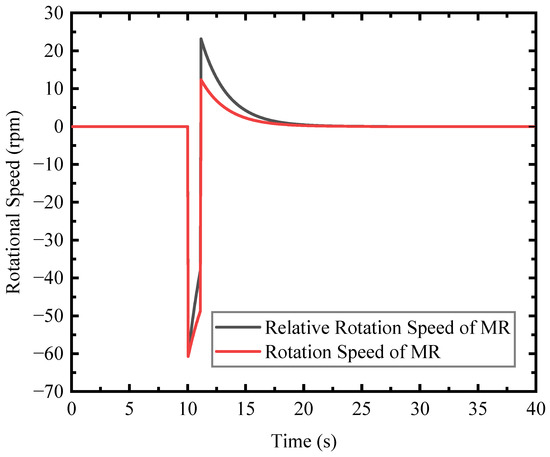 The first 10 s of the simulation process is as same as the static suspension process. At 10 s the rotational speed of the middle right EDWs decreases from 0 rpm to −61 rpm, and the rotational speed of the middle left EDWs increases from 0 rpm to 61 rpm. The driving forces generated by the right and left EDWs in the middle are equal in magnitude and opposite in direction, so torque is formed, which causes the maglev vehicle to rotate. The rotational speed of the middle EDWs relative to the conductor plate decreases due to the existence of the vehicle’s rotational speed and feedback regulation. During this period, the relative rotational speed of the front and rear EDWs remains 4000 rpm, so the driving force of the front EDW is equal to the driving force of the rear EDW and the translation speed of the maglev vehicle gradually remains to zero.