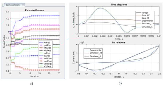An example of the optimization procedure is presented in Figure 1. It is related to the modified memristor model A13 for the representation of the processes of parameter estimation and obtaining the optimal values of the coefficients of the model. The trajectories of the memristor model parameters during the estimation procedure are presented in Figure 1a for the observation of their alteration. The derived optimal values of the memristor model parameters are applied to obtain the time diagrams of the memristor current and the corresponding current-voltage characteristics, which are presented in Figure 1b for comparison with the experimental memristor characteristics. The estimation procedures of the other considered memristor models are similar to the discussed one.