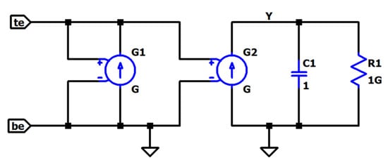 In this section, a compact equivalent LTSPICE schematic of the previously discussed memristor models is presented and explained in detail. The realization of the LTSPICE models of the considered metal-oxide memristors is based on the schematic, as presented in Figure 2 for a description of its basic blocks and operation. The equivalent circuit shown in Figure 2, is applied for the generation of all the considered standard and modified metal-oxide memristor models. The schematic is based on the two main equations in each memristor model: the current–voltage relationship and the state differential equation, relating the time derivative of the memristor state variable and the current (voltage). The memristor voltage is applied between its terminals, which are usually denoted by te (top electrode) and be (bottom electrode). Frequently, in the scientific literature, these electrodes are denoted by a (the anode) and c (the cathode). The current of the voltage-controlled current source G2 expresses the time derivative of the memristor state varies according to the corresponding state differential equation of the memristor model. The capacitor C1 is connected in parallel to it for the integration of its current and to obtain the memristor state variable. Its voltage is proportional to the state variable. The resistor R1 is connected in parallel to the capacitor C1 and ensures a smooth change in the voltage across it. In this way, the resistor R1 partially prevents convergence problems in the SPICE environment. The potential of the terminal Y is proportional to the memristor state variable. The memristor current is represented by the voltage-controlled current source G1 [,,].